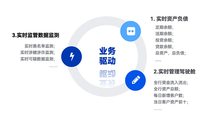 場(chǎng)景二:實(shí)時(shí)管理駕駛艙:通過實(shí)時(shí)獲取交易動(dòng)賬,對(duì)全行級(jí)別的資金流入流出金額、客戶資產(chǎn)、申貸金額及人數(shù)等指標(biāo)進(jìn)行實(shí)時(shí)展示;