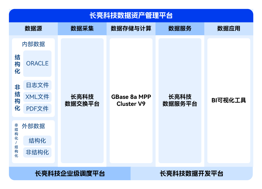 在該項目中,雙方基于南大通用GBase 8a MPP Cluster以及長亮科技數(shù)據(jù)開發(fā)、數(shù)據(jù)交換、企業(yè)級調(diào)度、指標(biāo)管理、數(shù)據(jù)補(bǔ)錄等平臺產(chǎn)品的組合方式,為承德銀行搭建了HADOOP+MPP 混搭架構(gòu)的基礎(chǔ)數(shù)據(jù)底座。其擁有數(shù)據(jù)采集、數(shù)據(jù)預(yù)處理、數(shù)據(jù)存儲、數(shù)據(jù)建模、數(shù)據(jù)分析、數(shù)據(jù)可視化等能力,可為全行數(shù)字化轉(zhuǎn)型提供數(shù)據(jù)支撐。