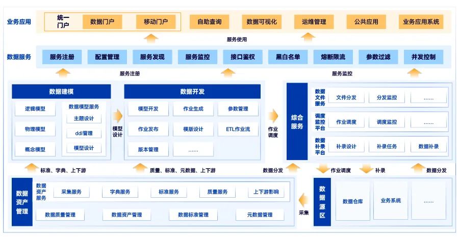 數據治理:將數據標準管理、元數據管理、數據安全、數據質量等集成到數據開發過程中,進行強管控。在設計態、開發態實現數據標準化、規范化,提升數據質量,減輕事后數據治理的壓力;