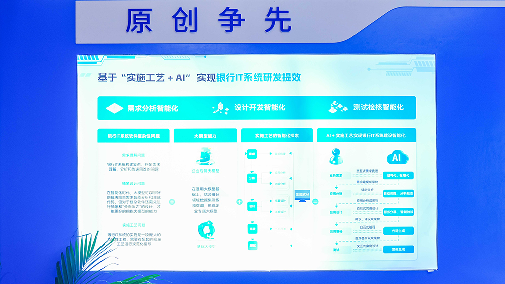 隨著人工智能時代的來臨,長亮科技認(rèn)為未來軟件工程將向著智能化編程、AI大模型的方向進(jìn)化,并創(chuàng)新探索出 “實施工藝+AI”這一前沿成果。通過將傳統(tǒng)業(yè)務(wù)需求轉(zhuǎn)化為結(jié)構(gòu)化的數(shù)字需求資產(chǎn),實現(xiàn)了從傳統(tǒng)代碼驅(qū)動到數(shù)字資產(chǎn)驅(qū)動的轉(zhuǎn)變,同時利用生成式AI技術(shù)在各個研發(fā)階段提供智能輔助,助力銀行重塑研發(fā)高效新模式,實現(xiàn)智能化的系統(tǒng)建設(shè)。