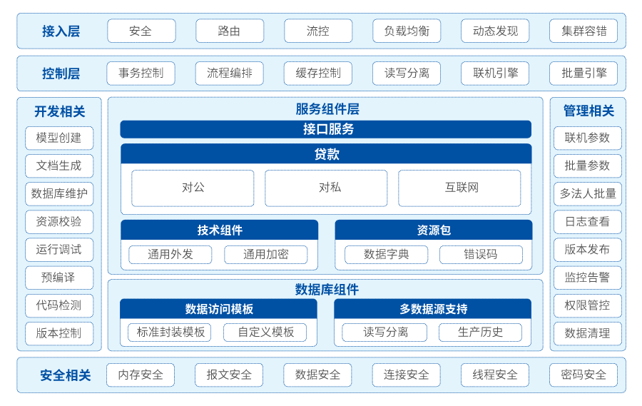 ■ 系統技術架構上分為接入層、控制層、數據層、基礎設施層,實現服務接入、事務控制、交易路由、聯機和批量平臺支持等;