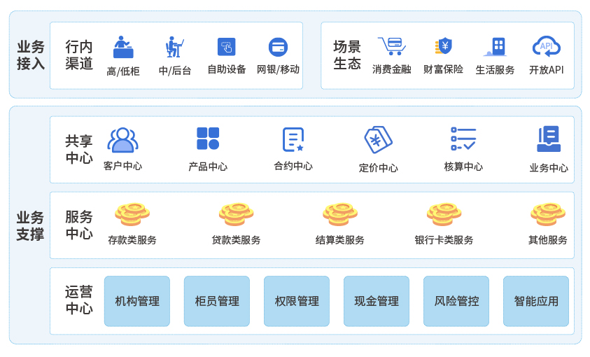 業務功能更全面:V8遵循以客戶為中心、以產品為主線、以數據為驅動的原則進行業務功能設計,基于組件化的技術方案構建面向銀行不同場景生態的業務處理中心。V8不僅擁有完善的多法人體系、靈活的交易與核算分離機制、全面的金融產品工廠、多模式的賬戶體系,還支持個性化的差異定價、線上線下的場景一體化處理,充分展現了以客戶為中心的全方位業務服務能力,同時為加快銀行數字化轉型進程、提升開放能力、搭建金融服務生態圈提供了強有力的交易引擎。