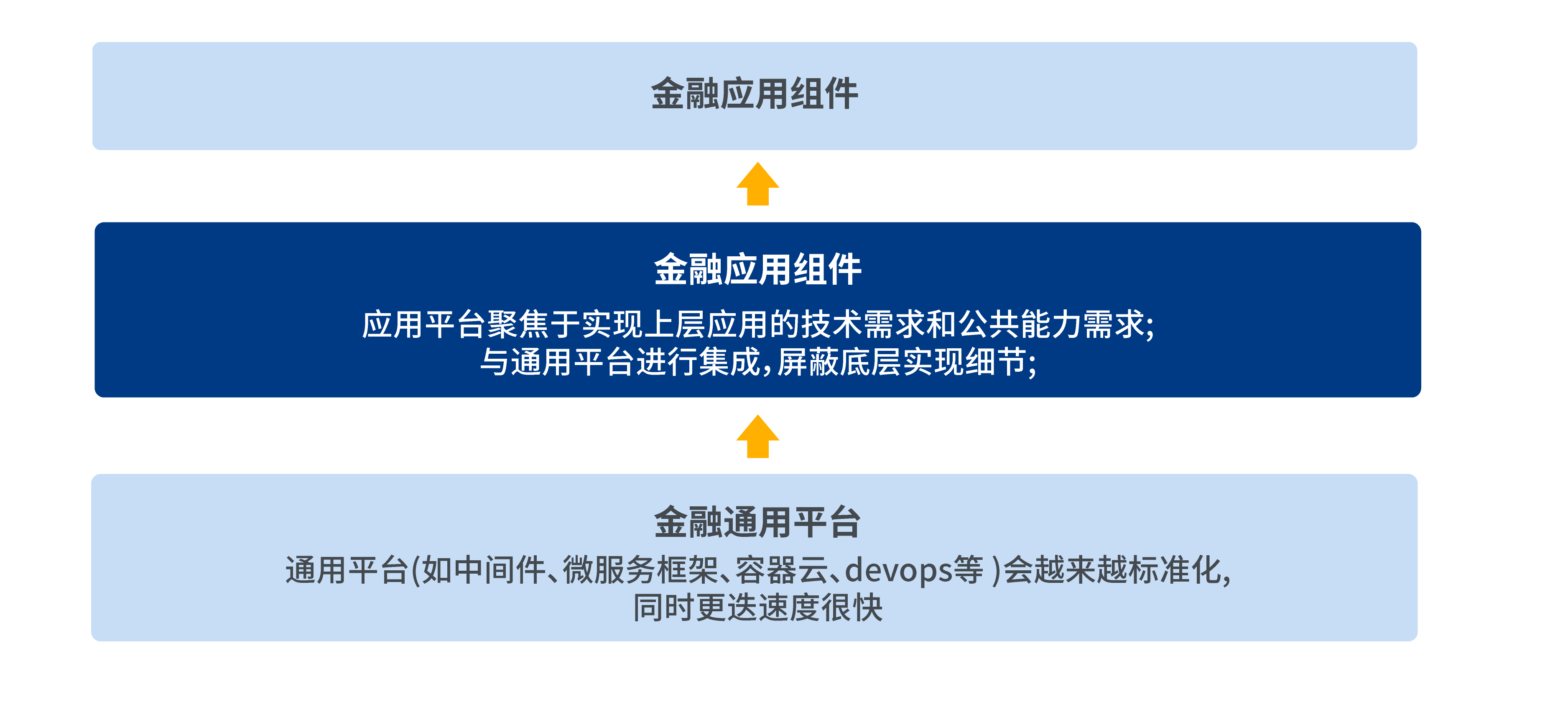 從字面上理解,“新一代”要突出數(shù)字化轉型、云原生等前瞻性和先進性的設計理念,“金融”修飾具體的運用場景,聚焦于金融領域,“應用”指主要服務于應用開發(fā)人員,提供統(tǒng)一的開發(fā)運行框架。