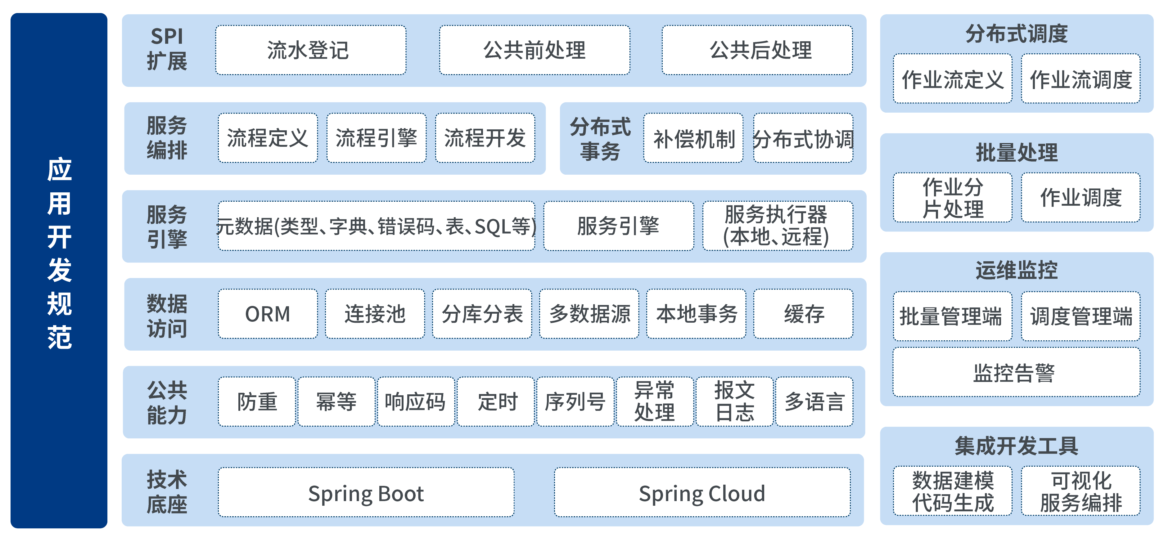 新一代金融應用平臺總體架構由聯(lián)機引擎(服務引擎、服務編排、分布式事務、元數(shù)據(jù)等)、批量引擎(分布式調度、批量處理)、公共能力(防重、冪等、序列號、數(shù)據(jù)訪問、SPI機制、技術底座等)、開發(fā)工具和開發(fā)規(guī)范組成。