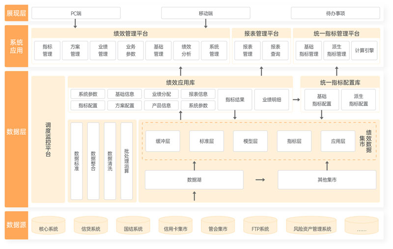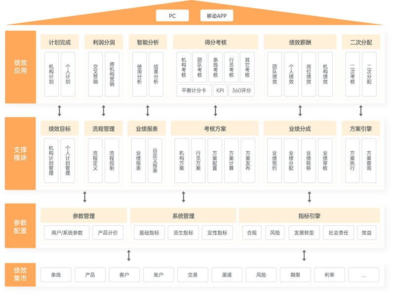 以銀行戰略為核心,輔助銀行實現價值鏈考核、精細化管理。通過全面指標計量管理、考核靈活配置管理,實現全行考核覆蓋;通過業績預約、業績認領、業績分配、業績轉移、業績復核、業績審批,進行業績全流程管理;同時以業績查詢、業績排行榜、關鍵業績等業績管理模塊,刺激全行積極性;配合APP移動端實現全行行為考核、移動辦公,助力銀行維護存量客戶、促進新客戶發展。