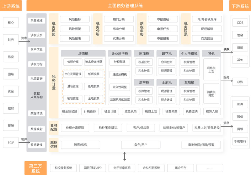 對金融機構(gòu)的增值稅及其附加稅、印花稅、房產(chǎn)稅、土地使用稅、車船稅、個人所得稅、企業(yè)所得稅等全部稅種進行涉稅事務管理,采集各稅種對應的業(yè)務數(shù)據(jù)形成涉稅檔案并計提相應稅費,自動出具納稅申報報表;集中實現(xiàn)了增值稅價稅分離、銷項管理、進項管理、發(fā)票開具、所得稅匯算清繳等功能,幫助企業(yè)及時分析稅負和籌劃稅務。
