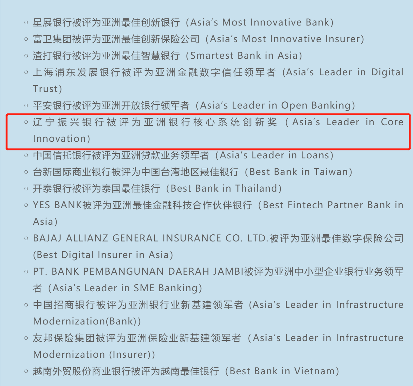 3月26日,IDC于新加坡公布了15家榮膺2021年亞太區(qū)金融行業(yè)創(chuàng)新大獎的金融機構,由長亮科技中標承建的遼寧振興銀行新核心項目憑借著在“微服務+單元化”創(chuàng)新技術應用方面的突出成績,榮獲“亞洲銀行核心系統(tǒng)創(chuàng)新獎”。