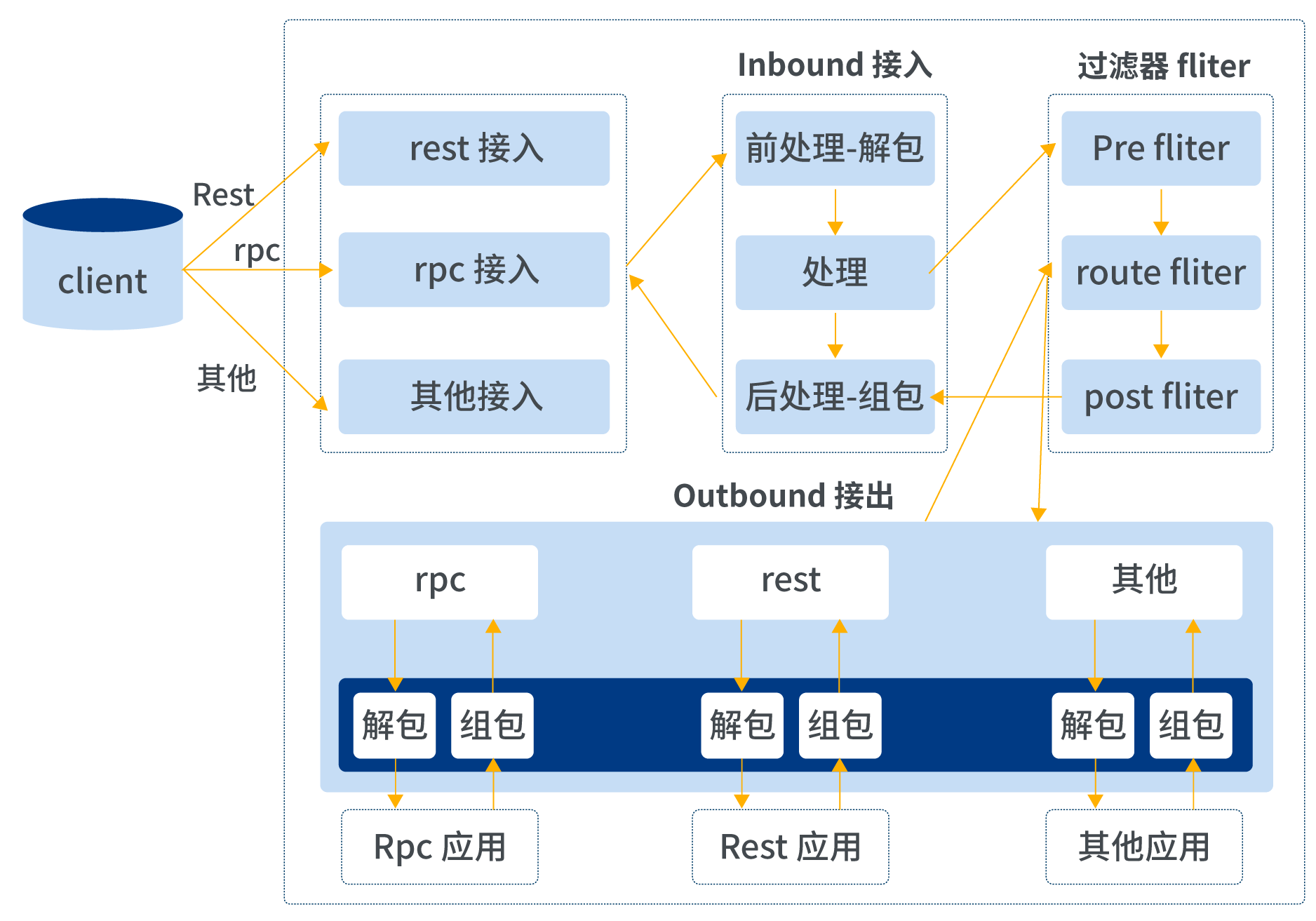 網關運行端采用了SPI機制,大大的增加了網關的擴展性,除市面上都支持的Fileter擴展、治理功能的擴展外,長亮科技還可提供接入接出(協議)的擴展,加解密方式、報文等多處位置的擴展,大大增加了網關的可擴展點:
